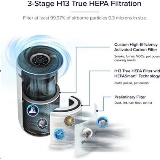 Druhou vrstvou je HEPA filter H13. To odlišuje Levoit od konkurencie, pretože filter HEPA H13 je oveľa kvalitnejší a spoľahlivejší ako bežne používané HEPA H11. Tu sa odfiltrujú jemné prachové častice, pleseň, baktérie, peľ, dymové častice, roztoče a srsť.