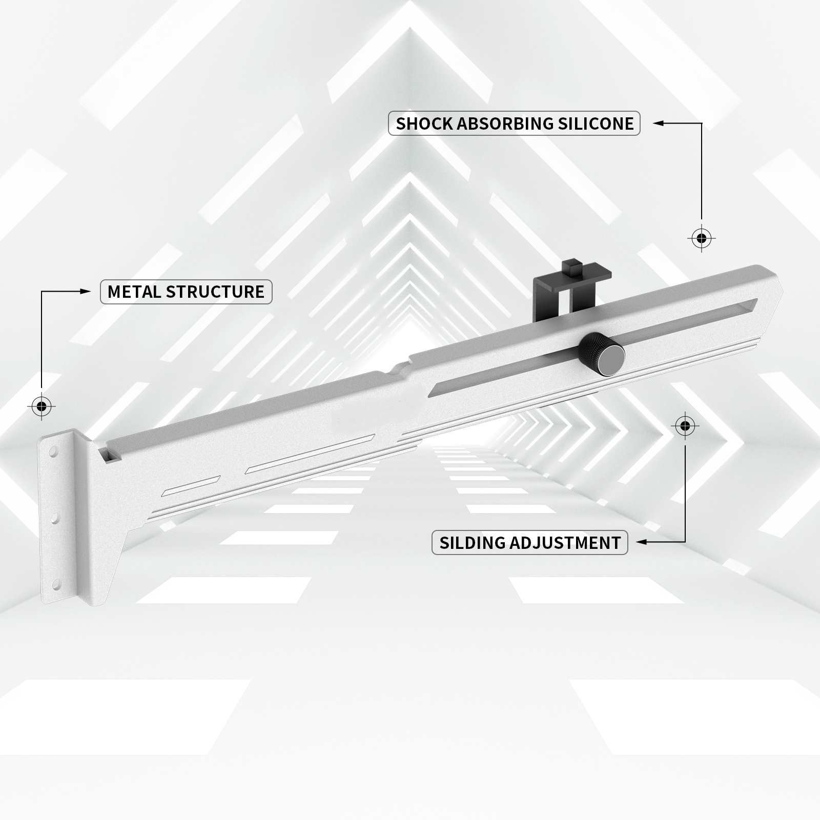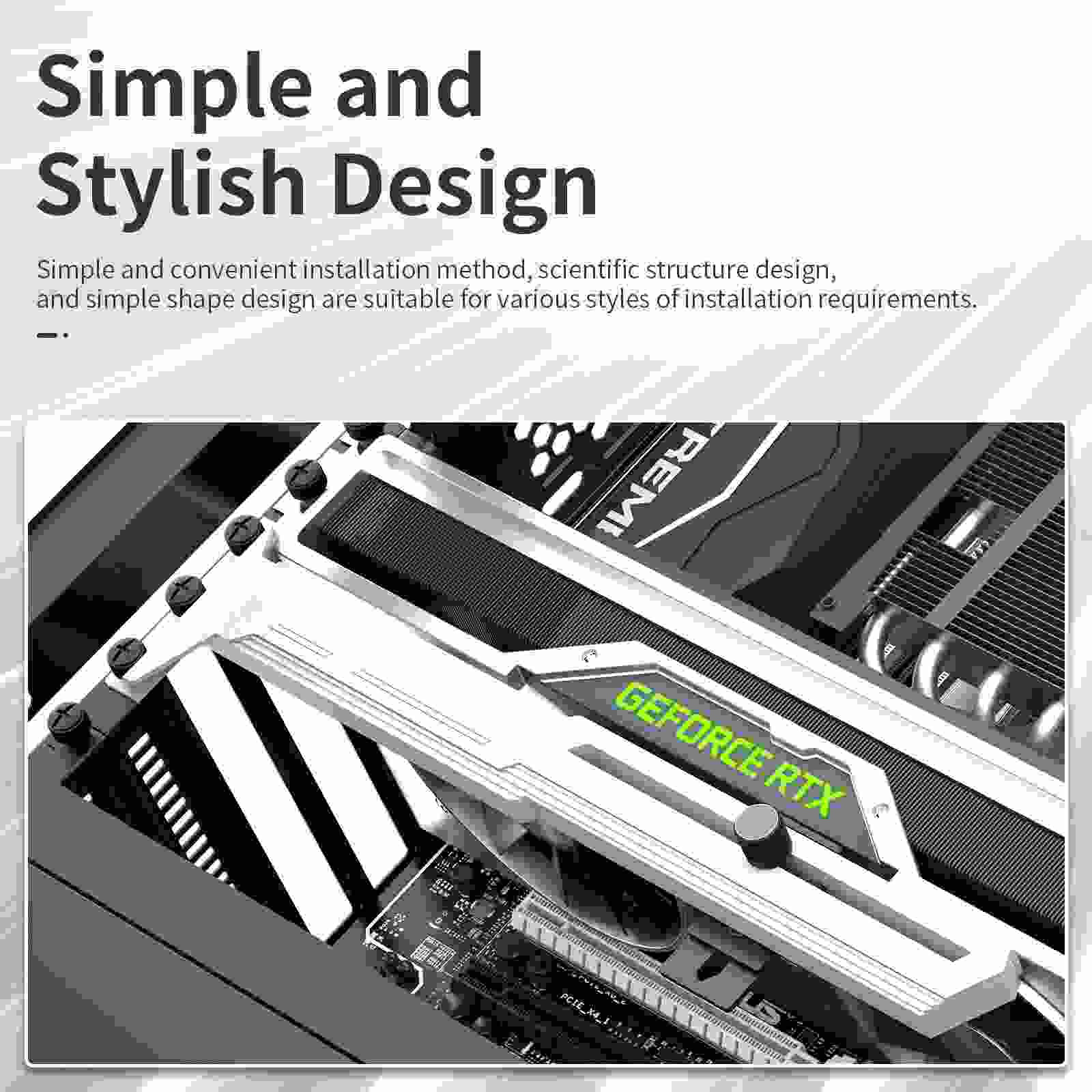 Štýlová verzia tejto opory vašej grafickej karty je vyrobená z oceľového práškového lakovaného plechu a plastu, zabraňuje prehýbaniu väčších kariet v zásuvke a dodáva tak zostave lepšiu celkovú stabilitu. Súčasťou je silikónová posuvná opora, ktorú možno posunúť horizontálne aj vertikálne a umožňuje inštaláciu na rôznych miestach karty, pre maximálnu kompatibilitu s väčšinou kariet. Rozmery držiaku sú 280 x 52 mm.