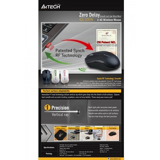 A4tech G3-200N, V-Track, bezdrôtová optická myš, 2.4GHz, dosah 10 m, čierna farba