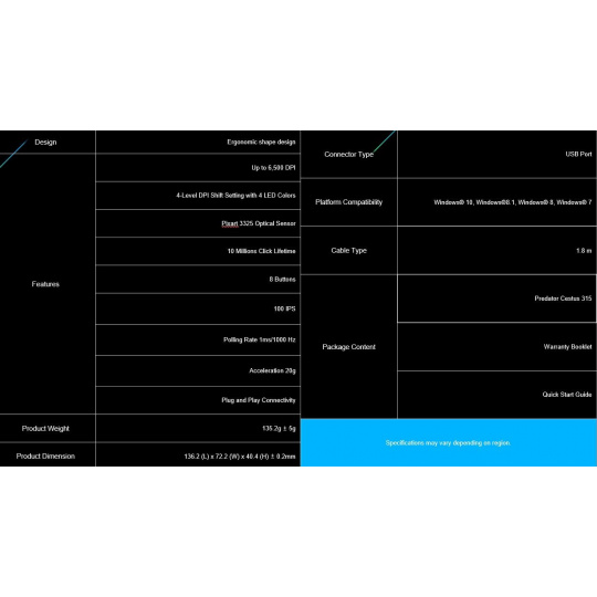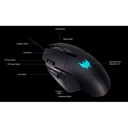 ACER PREDATOR CESTUS 315 - herná myš, 4 úrovne DPI 800-6500dpi, senzor Pixart 3325, IPS/rýchlosť 100, 8 tlačidiel