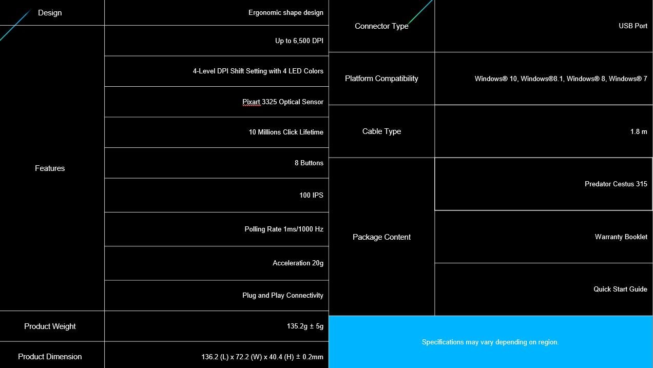 ACER PREDATOR CESTUS 315 - herná myš, 4 úrovne DPI 800-6500dpi, senzor Pixart 3325, IPS/rýchlosť 100, 8 tlačidiel
