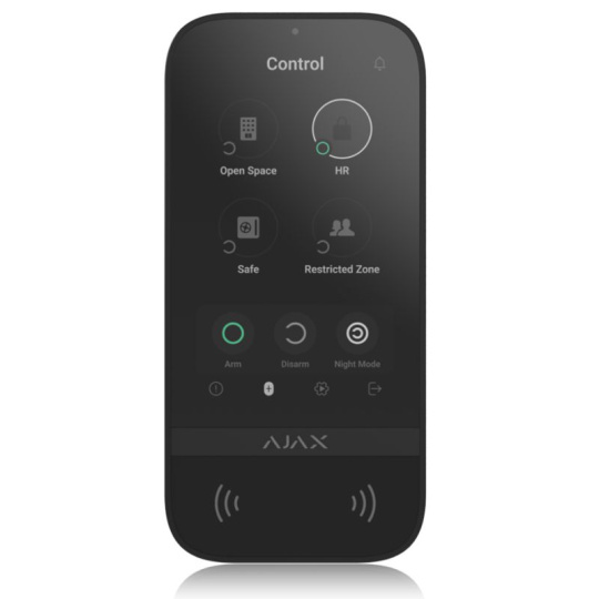 Klávesnica KeyPad TouchScreen zdedila rozhranie aplikácií Ajax pre chytré telefóny a poskytuje tak jednoduché a známe ovládanie systému. Päťpalcová dotyková obrazovka umožňuje rýchly prístup k aktuálnemu režimu zabezpečenia ľubovoľnej skupiny. Aktivuje sa zdvihnutím ruky v blízkosti a má automatickú reguláciu jasu. Klávesnica má zvukovú indikáciu a môže upozorňovať na alarmy, oneskorenie pri vstupe/výstupe a otvorenie dverí pri odomknutí systému. Hlasitosť sa nastavuje v aplikáciách Ajax. Klávesnica tiež zobrazuje výsledok kontroly integrity systému a informuje o poruchách pri zastrešení.