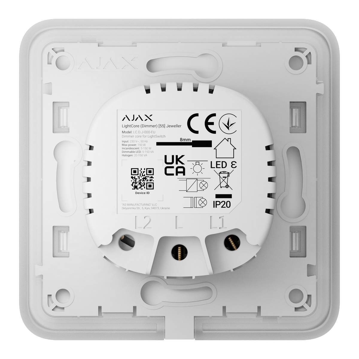 Ajax LightSwitch Dimmer Jeweller je chytrý dotykový nástenný stmívač pre osvetlenie určený pre vnútornú inštaláciu.