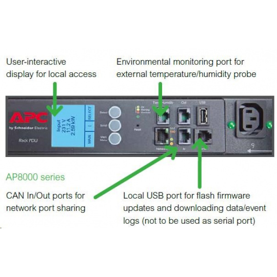 - Samostatné meranie výkonu na jednotlivých zásuvkách poskytuje podrobnejší prehľad o napájaní zariadení v skrini. Poskytuje tiež možnosť analyzovať vývoj výkonu komponentov a plánovanej kapacity.