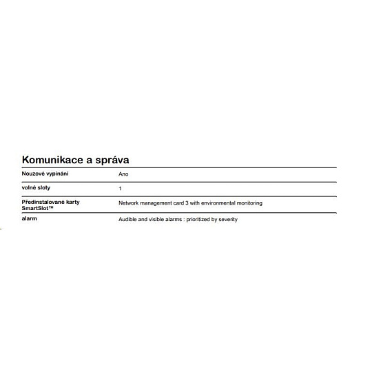 | Obsah dodávky | CD so softvérom, Disk CD s dokumentáciou, Inštalačná príručka, Záručná karta EPO Terminálny blok, Tepelný senzor, USB kábel, RJ45-DB9 kábel, Console-DB9 kábel, 2 ks káblov 2m C19-C20, Odnímateľná podpora, Rack montážne úchyty |