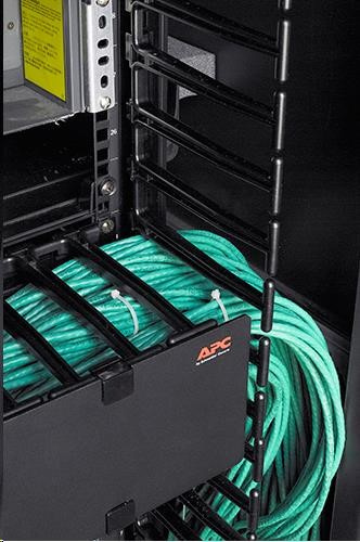 dvojdielne sekcie na správu káblov majú na každej pozícii 1U hladké plastové výstupky, ktoré umožňujú riadny vstup a výstup prepojovacích káblov.