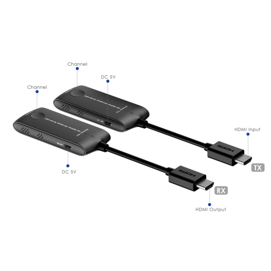 PremiumCord 4K@60Hz HDMI Wireless extender na 20m - Bezdrôtový vysielač a prijímač signálu HDMI na spojenie na 20m - Podporuje bezdrôtový prenos rozlíšenia 4K@60Hz a Full HD 1080p na vzdialenosť až 20m - Maximálny dátový tok: 18Gbps - Wifi frekvencia: 5 až 5,8GHz - Podporované rozlíšenie obrazu: 4K@60Hz/50Hz/30Hz, 2K@60Hz/50Hz/30Hz, FULL HD 1080p@50/60Hz, 1080i@50/60Hz, 720p@50/60Hz - Podporuje: 3840x2160@24/30/50/60Hz (YUV 4:4:4, YUV 4:2:2 a RGB), 1080P@50/60Hz, 720P@50/60Hz, 1920x1200@60Hz - Podporuje HDMI2.0 - Plne podporuje HDCP2.2 - Podporuje SSID párovanie - Audio formát PCM - Vysielač je malý dongle, ktorý sa zasunie priamo do konektora HDMI počítača, notebooku. Vysielač je napájaný pomocou USB kábla z USB portu. - Prijímač je malý dongle, ktorý sa zasunie priamo do HDMI konektora monitora alebo projektora. Prijímač je napájaný pomocou USB kábla z USB portu. - Jednoduchá inštalácia bez nutnosti ďalšieho SW - Vstupné konektory: HDMI konektor vidlica - Výstupné konektory: HDMI konektor vidlica - Odozva menej než 150ms - Extender je napájaný pomocou priložených USB micro káblov, ktoré sa zasunú do USB portu alebo USB napájacieho adaptéra. Extender môže fungovať bez externého USB napájania, no v prípade výpadku obrazu alebo zhoršenia zvuku, zapojte USB napájanie, pretože napájanie z HDMI konektora nestačí. - Vysielacie a prijímacie adaptéry majú krátky HDMI kábel pre jednoduché zapojenie do počítača a zobrazovacej jednotky alebo TV. - Vzdialenosť prenosu závisí od skutočného prostredia. - Prevádzková teplota: -20°C až 60°C - Vlhkosť: 0-90% (nekondenzujúca) - Rozmery TX a RX: 40mm x 200mm x 15mm - Hmotnosť TX: 40g, RX: 40g - Kryt čierne plastové Pre zariadenie je vhodné zabezpečiť optimálne podmienky pre prenos bezdrôtového signálu: 1, Odstrániť rušenie signálu iným bezdrôtovým zariadením a odstrániť prekážky, ktoré stojí signálu v ceste (kovové steny, sklo, RF rušenie a pod. v ceste signálu) 2, Signál môžu rušiť aj vplyvy vonkajšieho prostredia, ako je mikrovlnná rúra, bezdrôtové myši a klávesnice, 3. Uistite sa, že vysielacia jednotka je minimálne 20 až 30 cm od steny a je zhruba v rovnakej línii ako prijímacia anténa zariadenia na druhej strane. Extender nemusí pracovať dobre v špecifických miestach ako sú napr. suterén, tunel a pod. Set sa skladá - 1x vysielač – Transmitter - 1x prijímač – Receiver - 2x kábel USB – micro USB pre napájanie prijímača a vysielača