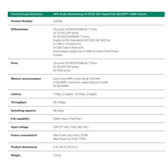 Aruba 6100 12G Class4 PoE 2G/2SFP+ 139W Switch JL679A RENEW.