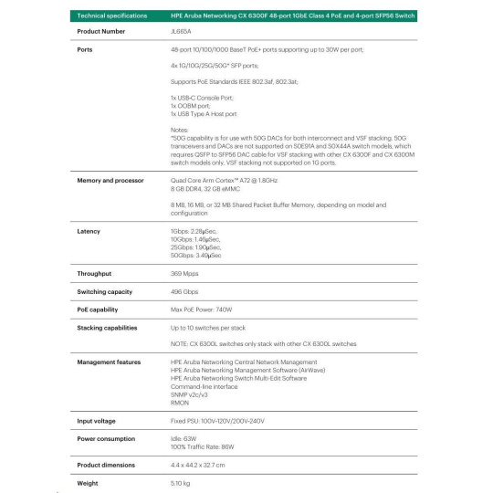 HPE Aruba Networking CX 6300F 48-port 1GbE Class 4 PoE and 4-port SFP56 Switch