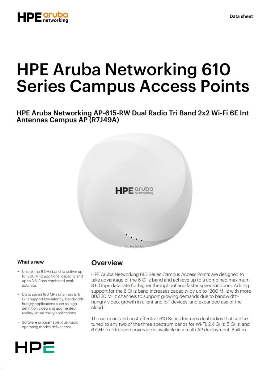 | Summary Aruba 610 Series Access Points are designed to take advantage of the 6 GHz band using two radios that can deliver comprehensive tri-band coverage in a multi-AP environment and better meet the growing demands of Wi-Fi due to increased use of video, growth in client and IoT devices, and expanded use of cloud. With a 3.6 Gbps combined peak data rate for higher throughput and faster speeds for indoor use, the Aruba 610 Series delivers a cost-effective enterprise Wi-Fi 6E solution with increased capacity, wider channels, reduced power consumption. |