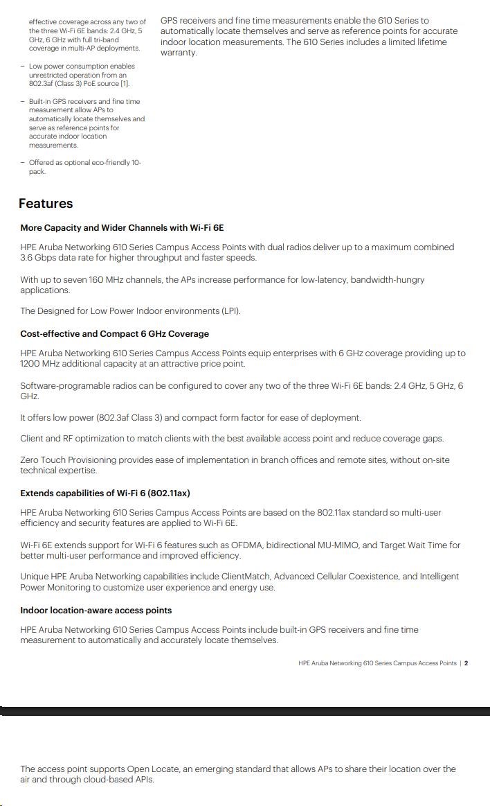 | Wi-Fi Optimization Client Optimization Aruba's patented AI-powered technology eliminates sticky client issues by steering a client to the AP where it receives the best radio signal. ClientMatch steers traffic from the noisy 2.4 GHz band to the preferred 5 GHz or 6 GHz band depending on client capabilities and AP setttings. ClientMatch also dynamically steers traffic to load balance APs to improve the user experience. Automated Wi-Fi Radio Frequency Management To optimize the user experience and provide greater stability, Aruba AirMatch allows organizations to automate network optimization using machine learning. AirMatch provides dynamic bandwidth adjustments to support changing device density, enhanced roaming using an even distribution of Effective Isotropic Radiated Power (EIRP) to radios, and real-time channel assignments to mitigate co-channel interference. AirMatch also ensures that the two radios of Aruba 610 Series Access Points are automatically configured in the most effective and efficient way to deliver full tri-band coverage. Application Assurance With Aruba Air Slice, organizations can provide application assurance to their users that goes beyond the traditional capabilities of airtime fairness. After the SLAs are configured, Air Slice monitors network usage, automatically allocates radio resources, and dynamically adjusts radio resources as new users connect and applications sessions begin or end. Aruba Advanced Cellular Coexistence (ACC) Unique to Aruba, Advanced Cellular Coexistence uses built-in filtering to automatically minimize the impact of interference from cellular networks, distributed antenna systems (DAS), and commercial small cell or femtocell equipment. Intelligent Power Monitoring (IPM) For better insights into energy consumption, Aruba APs continuously monitor and report hardware energy usage. Unlike other vendor's access points, Aruba APs can also be configured to enable or disable capabilities based on available PoE power - ideal when wired switches have exhausted their power budget. Enterprises can deploy Wi-Fi 6E APs and update switching and power at a later if needed based on their actual usage. Self-Locating APs Indoor location shouldn't require guesswork or costly overlay technologies. Aruba's Wi-Fi 6 and 6E APs help organizations leverage their wireless investment to deliver indoor location - everywhere. Aruba 610 Series Campus APs include built-in GPS receivers and intelligent software to allow them to automatically locate themselves accurately within the universal framework of latitude and longitude. As part of Aruba's indoor location services solution, they serve as reference points for client devices using fine time measurements (802.11mc) and other location technologies. In addition, Aruba's Wi-Fi 6 and 6E APs support Open Locate, an emerging standard that allows APs to share their location over the air and through cloud-based APIs, enabling mobile devices to locate themselves and applications to support network analytics. APs as an IoT transport platform The Aruba 610 Series includes an integrated Bluetooth 5 and 802.15.4 radio for Zigbee support to simplify deploying and managing IoT-based location services, asset tracking services, security solutions, and IoT sensors. There is also a USB-port extension to provide IoT connectivity to a wider range of devices. These IoT capabilities allows organizations to leverage Aruba APs as an IoT transport platform, which eliminates the need for an overlay infrastructure and additional IT resources and can accelerate IoT initiatives. In addition, Target Wake Time (TWT), part of the 802.11ax standard, establishes a schedule for when clients need to communicate with an AP. This helps improve client power savings and reduces airtime contention with other clients, which is ideal for IoT. Aruba secure infrastructure The Aruba 610 Series includes build-security capabilities such as: