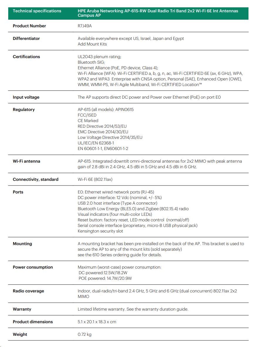 | Aruba AP-615 (US) Dual-radio Tri-band 2x2:2 802.11ax Wi-Fi 6E Internal Antennas Campus AP | R7J50A |