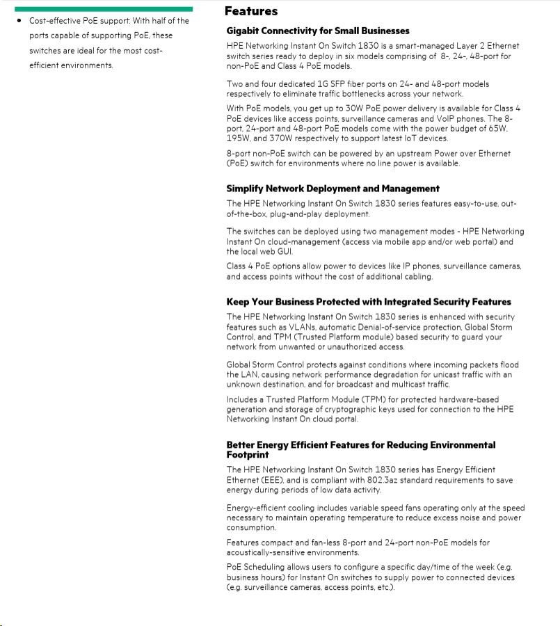 | Aruba Instant On 1830 8G Switch (JL810A) | Aruba Instant On 1830 8G 4p Class4 PoE 65W Switch (JL811A) | Aruba Instant On 1830 24G 2SFP Switch (JL812A) | Aruba Instant On 1830 24G 12p Class4 PoE 2SFP 195W Switch (JL813A) | Aruba Instant On 1830 48G 4SFP Switch (JL814A) | Aruba Instant On 1830 48G 24p Class4 PoE 4SFP 370W Switch (JL815A) | ||||||||