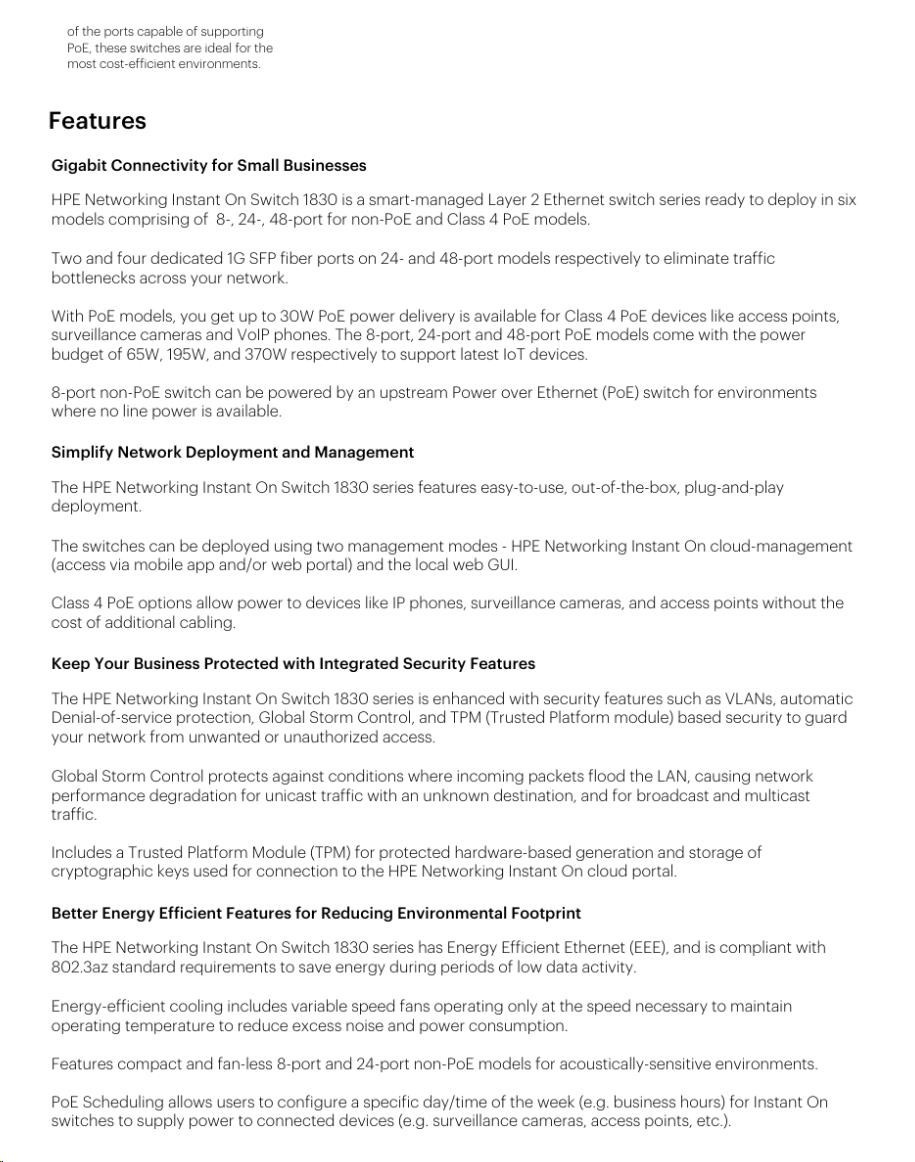 | Aruba Instant On 1830 8G Switch (JL810A) | Aruba Instant On 1830 8G 4p Class4 PoE 65W Switch (JL811A) | Aruba Instant On 1830 24G 2SFP Switch (JL812A) | Aruba Instant On 1830 24G 12p Class4 PoE 2SFP 195W Switch (JL813A) | Aruba Instant On 1830 48G 4SFP Switch (JL814A) | Aruba Instant On 1830 48G 24p Class4 PoE 4SFP 370W Switch (JL815A) | ||||||||