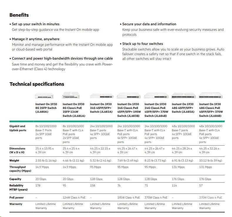 Whether you own a cafe, a design firm or a tech startup, a reliable and secure network plays a critical role in the success of your business. And you need a network solution that gives you peace of mind, allowing you to focus on growing your business instead of managing problems with your network. Aruba Instant On makes it easy to keep network users happy, mobile and IoT devices connected, and your network secure. The Aruba Instant On 1930 switches features advanced, smart-managed, fixed- configuration Gigabit switches designed for small businesses that are easy-to-deploy and affordable. They're made to handle today's bandwidth-heavy applications like voice and video conferencing, enabling consistent connectivity to enhance performance. Using either the Instant On mobile app or the cloud-based web portal, you can quickly set up, monitor and manage the 1930 switch series from anywhere at any time. What's more, up to 30 W PoE power delivery is available out-of-the-box for your class 4 PoE devices, like access points, surveillance cameras and VoIP phones, all easily managed from the same platform. Built-in security features protect your network from unauthorized access by allowing you to segment traffic and define access to each area of the network. And all of this is included in the price of the hardware - there are no hidden subscription or licensing fees.