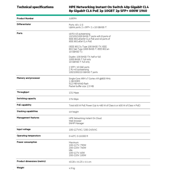 HPE Networking Instant On Switch 40p Gigabit CL4 8p Gigabit CL6 PoE 2p 10GBT 2p SFP+ 600W 1960 (JL809A)