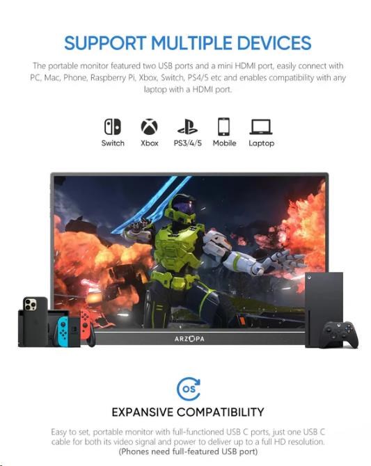 Arzopa Z1RC je přenosný monitor, který kombinuje vynikající kvalitu obrazu s kompaktním designem. Jeho 16" obrazovka nabízí rozlišení 2560 x 1600 p s obnovovací frekvencí 60 Hz, díky čemuž si můžete vychutnat dynamický obraz s bohatými detaily. Je kompatibilní se širokou škálou zařízení a díky možnosti zobrazovat obraz na výšku i na šířku jej přizpůsobíte svým preferencím. Snadno se vám vejde do tašky nebo batohu a poskytne vám možnost pracovat nebo se bavit kdekoli.