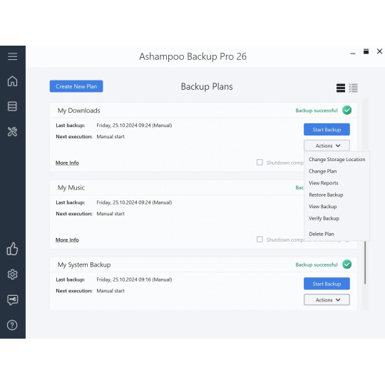 Naše zálohovacie riešenie je vhodné pre každého, od začiatočníkov až po špecialistov na bezpečnosť dát. Preto sme naše záložné plány urobili čo najflexibilnejšie a najuniverzálnejšie! Nové predvoľby uložia vaše údaje len niekoľkými kliknutiami. Chcete zálohovať iba dokumenty alebo celý systém? Chcete uložiť e-maily, kontakty alebo údaje prehliadača? Alebo uprednostňujete sofistikovanejší prístup s vlastnými plánmi špeciálne prispôsobenými vašim potrebám? Aj veľmi sofistikované záložné plány vyžadujú len niekoľko kliknutí. Jednoduché alebo sofistikované, vytváranie záložných plánov je hračka s novým Ashampoo Backup Pro!
