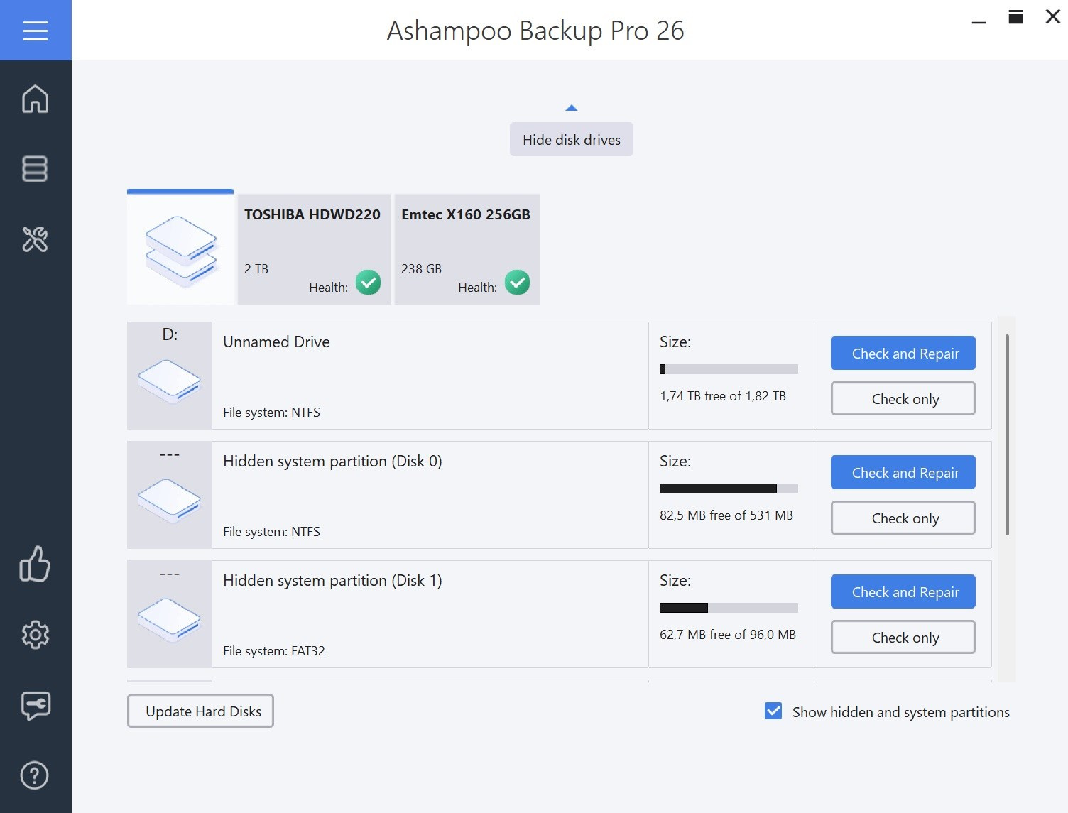 Záloha je len taká bezpečná, ako pevný disk, na ktorom je uložená! Preto Ashampoo® Backup Pro monitoruje parametre S.M.A.R.T. vášho pevného disku počas zálohovania, aby zistil budúce problémy skôr, ako sa vyskytnú! To vám dáva čas reagovať a zabrániť strate údajov. Program je tiež vybavený prídavnou kontrolou diskov/oddielov, ktorá analyzuje a opravuje jednotlivé sektory. Či už ide o interný alebo externý disk, Ashampoo® Backup Pro sa o vaše pevné disky postará mimoriadne dobre!