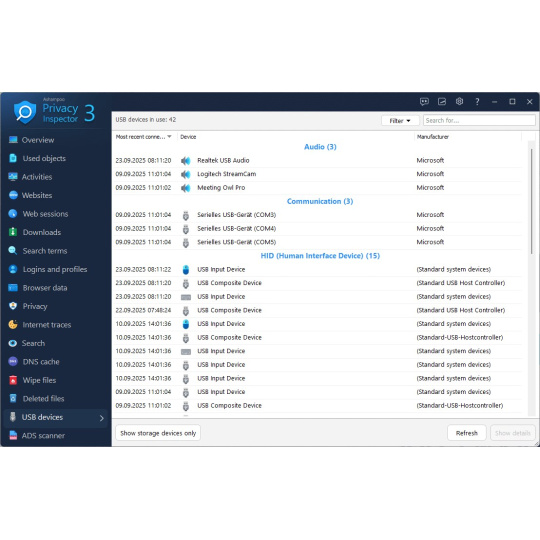 Ashampoo Privacy Inspector se vrátil, nyní robustnější a všestrannější než kdy dříve! Mějte komplexní kontrolu nad svými daty a zařízeními: Výkonná vyhledávací funkce odhaluje uložené informace a podezřelý obsah, zatímco přehled USB zařízení poskytuje přesné podrobnosti o tom, kdy a jaký hardware byl k vašemu počítači připojen. ADS Scanner navíc odhalí neviditelné datové toky.
