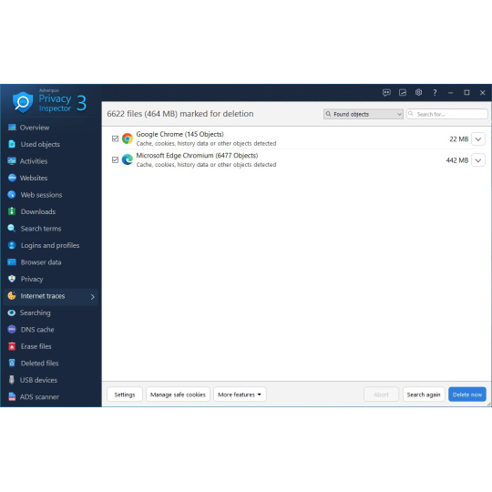 Někdy potřebujete zkontrolovat své poslední aktivity na internetu. Jak jste se na danou stránku dostali a co jste hledali? Ashampoo Privacy Inspector vám pomůže analyzovat webové relace pomocí rozsáhlého seznamu nebo stromového zobrazení, které zahrnuje všechny vaše online aktivity. Oživte svou historii prohlížení webu a už nikdy neztraťte nit.