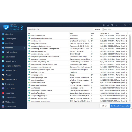 Mnoho webů dnes vyžaduje přihlášení pomocí vyhrazených uživatelských jmen a hesel. Kde jste tedy dnes nechali své přihlašovací údaje? Jaké informace jste přesně zadali do formulářů a jak často jste navštěvovali dotčené stránky? Užijte si 100% transparentnost a přesnost s Ashampoo Privacy Inspector ještě dnes!