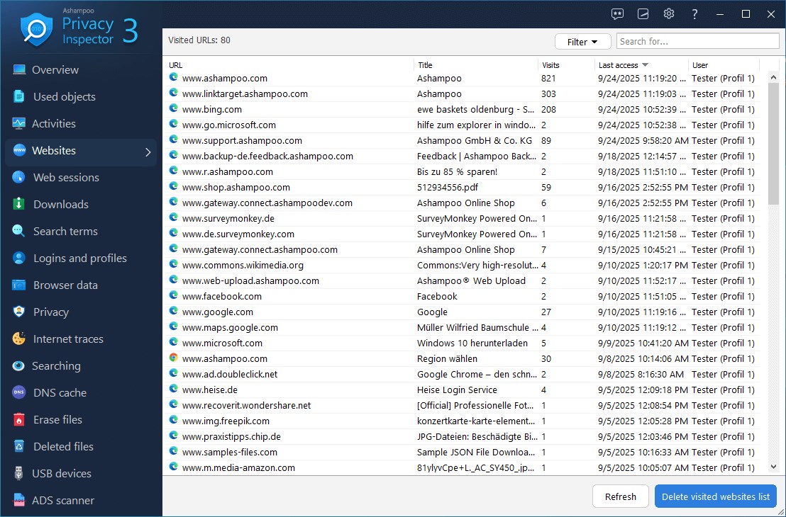 Mnoho webů dnes vyžaduje přihlášení pomocí vyhrazených uživatelských jmen a hesel. Kde jste tedy dnes nechali své přihlašovací údaje? Jaké informace jste přesně zadali do formulářů a jak často jste navštěvovali dotčené stránky? Užijte si 100% transparentnost a přesnost s Ashampoo Privacy Inspector ještě dnes!