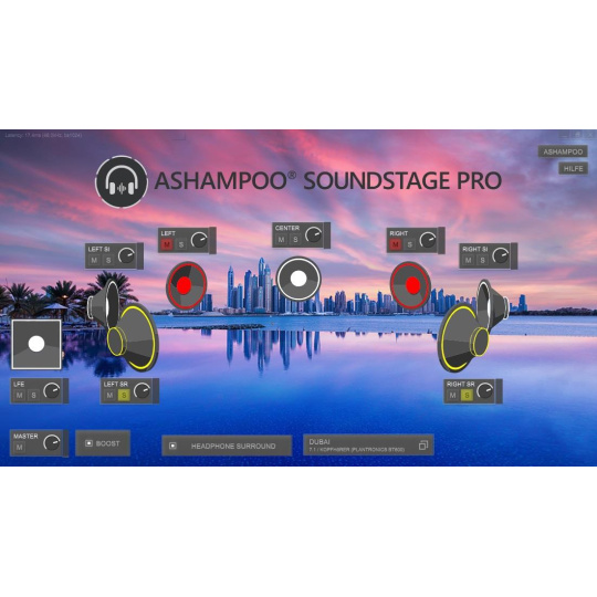 Ashampoo Soundstage Pro poskytuje všestranný zážitok z počúvania. Zvukové štandardy ako 5.1, 6.1 a 7.1 v kombinácii s desiatimi virtuálnymi miestami vytvárajú sofistikované zvukové prostredie so zadnými a bočnými reproduktormi, ktoré sú ľahko identifikovateľné. Ashampoo Soundstage Pro nezvyšuje existujúce zvukové signály, ale závisí od existencie skutočných priestorových informácií v pôvodnom zvukovom signáli. To je jediná záruka vysokokvalitného zvukového zážitku!