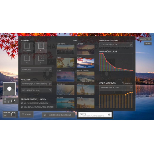 Program vám ponúka desať rôznych audio miest, z ktorých si môžete vybrať! Tieto predvoľby vytvorili odborníci v profesionálnych nahrávacích štúdiách. Zažite celú škálu verného priestorového zvuku! Individuálne nastavenie hlasitosti pre každý virtuálny reproduktor je samozrejmosťou!