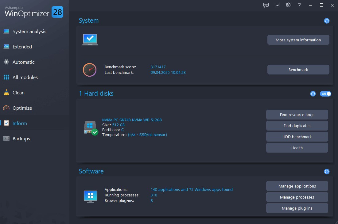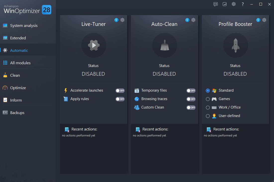S novým programom Ashampoo WinOptimizer 28 získate automaticky najlepší zážitok z práce s Windowsom. Jeho nová automatizácia zrýchľuje, čistí a ladenie vaše aplikácie. Nechajte svoj počítač plynule prispôsobiť vašim potrebám pomocou priorít procesov, automatického čistenia dočasných súborov a vlastných konfigurácií profilov na základe nového nástroja Profile Booster. Či už ide o hranie hier, prácu alebo prehliadanie webu, maximalizujte výkon systému alebo šetrite prostriedky, voľba je na vás. Nový nástroj Crash Analyzer ponúka hlboký pohľad na pády systému a ich príčiny, zatiaľ čo štyri pokročilé čističe zabezpečujú súkromie a poskytujú údržbu systému. Vďaka vylepšenej správe pamäti dokáže WinOptimizer využiť viac prostriedkov na vykonávanie komplexných analýz takmer okamžite!