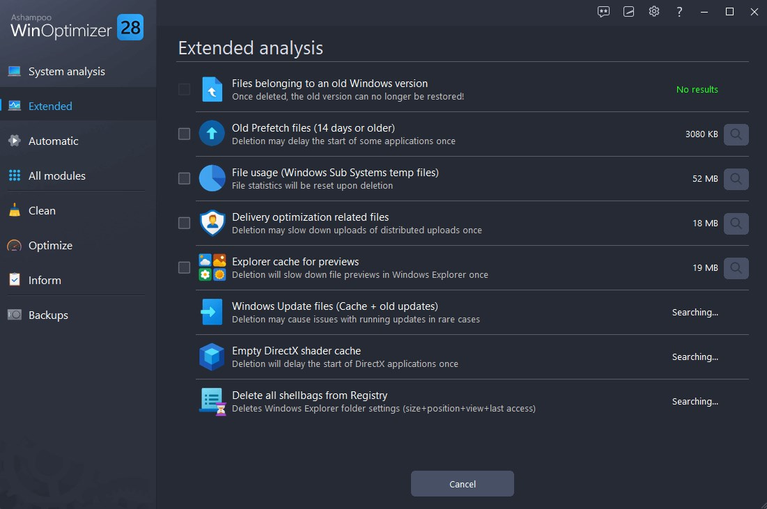 S novým a rozšíreným hlbokým čistením vstupuje hon na nepotrebné súbory do novej fázy - a problémy so súkromím a zobrazením je teraz tiež možné ľahko vyriešiť! Zbavte sa starých verzií systému Windows, záloh aktualizácií systému Windows a štatistík používania systému Windows. Problémy s zobrazením vo hrách vyriešite vyprázdnením cache shaderov DirectX a pomalý Prieskumník Windows zrýchlite vymazaním cache náhľadov. Získate pritom tiež veľa miesta na pevnom disku.