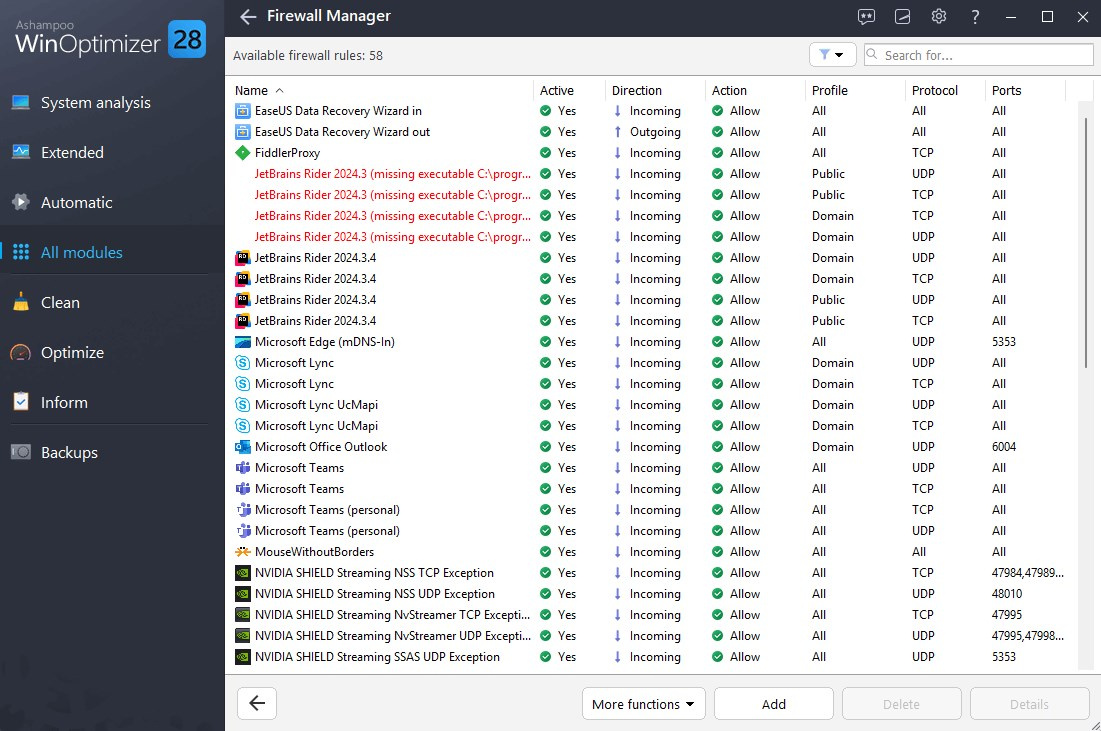 Máte prehľad o tom, ktoré aplikácie majú prístup k internetu? Zaujíma vás, čo prichádza a odchádza a ktoré pravidlá môžu byť zastarané? S novým Správcom brány Firewall môžete plne kontrolovať sieťový prevádzku. Jednoducho zistíte, čo je povolené a kde by bolo treba zasiahnuť. Vďaka základnému, štandardnému a pokročilému režimu, inteligentným filtrom a filtru pre vyhľadávanie deaktivovaných alebo chybových pravidiel rýchlo zistíte, ktoré aplikácie môžu odosielať alebo prijímať dáta, a môžete rozhodnúť, čo má byť povolené alebo blokované. Prevezmite späť kontrolu nad prevádzkou svojho počítača len niekoľkými kliknutiami.