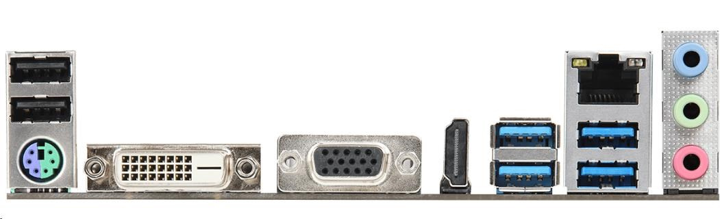 | Vstupy/výstupy na zadnom paneli | - 1 x port PS/2 pre myš/klávesnicu - 1 x port D-Sub - 1 x port DVI-D - 1 x port HDMI - 2 x USB 2.0 Porty (podporuje ochranu proti ESD) - 4 x USB 3.1 port Gen1 (podporuje ochranu proti ESD) - 1 x RJ-45 LAN port s LED diódou (ACT/LINK LED a SPEED LED) - HD audio konektory: Line in / Front Speaker / Microphone |