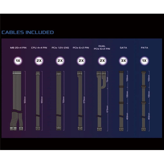 | Dvojitý PCIe 6+2 Pin Konektor | 2x / 2x (675 + 75 mm) |