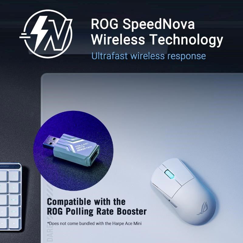ROG Harpe Ace Mini je extrémne ľahká 49 gramová polosymetrická herná myš s tvarom schváleným profesionálnymi hráčmi FPS. ROG Harpe Ace Mini je vybavená optickým senzorom ROG AimPoint Pro s rozlíšením 42 000 dpi a optickými mikroprepínačmi ROG, ktorý zobrazuje špičkový bezdrôtový výkon s bezdrôtovou technológiou SpeedNova a podporuje až 8 000 Hz bezdrôtovú rýchlosť dotazovania (kompatibilné s ROG Polling Rate Booster).