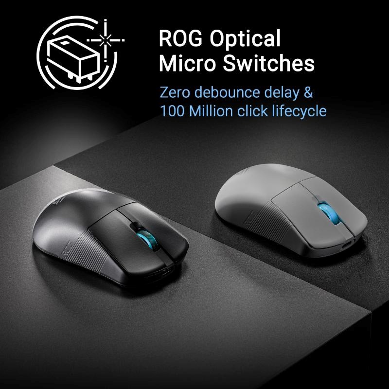 - Optické mikrospínače ROG: Okamžitá aktivácia s každým ostrým kliknutím a životnosť 100 miliónov kliknutí