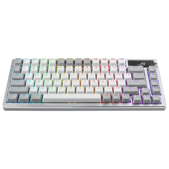 Zakázková herná klávesnica ROG Azoth s tvarovým faktorom klávesnice 75, tesnením, trojvrstvou tlmiacou penou a kovovým horným krytom, vysoko prispôsobiteľná s predom namazanými mechanickými spínačmi ROG NX vymeniteľnými za chodu, stabilizátory klávesnice ROG, kryty kláves PBT doubleshot a mazacou sadou, tri režimy pripojenia s technológiou SpeedNova na 2,4 GHz, OLED displejom, trojcestným ovládacím gombíkom, tromi uhlami náklonu a podporou Mac