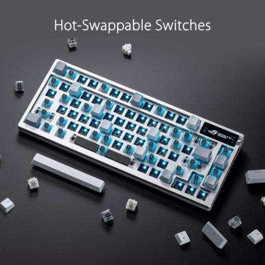 - Mechanické spínače ROG NX vymeniteľné za chodu: Predom namazané spínače pre plynulejšie cvaknutie a elimináciu odskakovania; rýchle ovládanie a vyladené krivky sily ROG poskytujú skvelý pocit a konzistenciu kláves