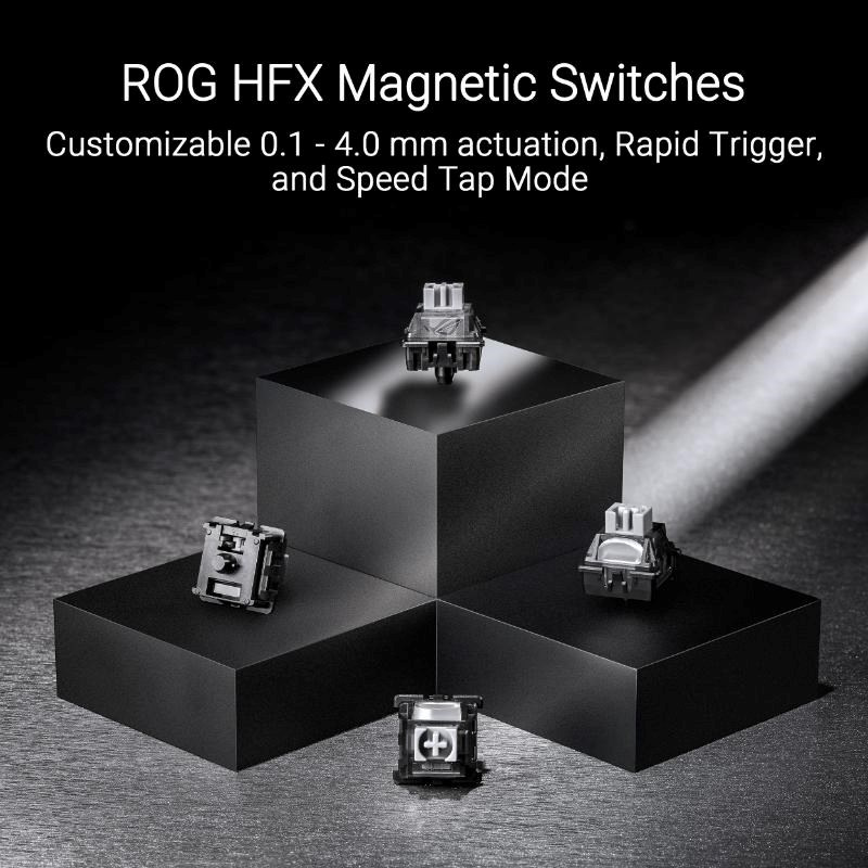 - Magnetické spínače ROG HFX: Má nastaviteľné ovládanie 0,1 - 4,0 mm pre okamžitý stlač klávesov