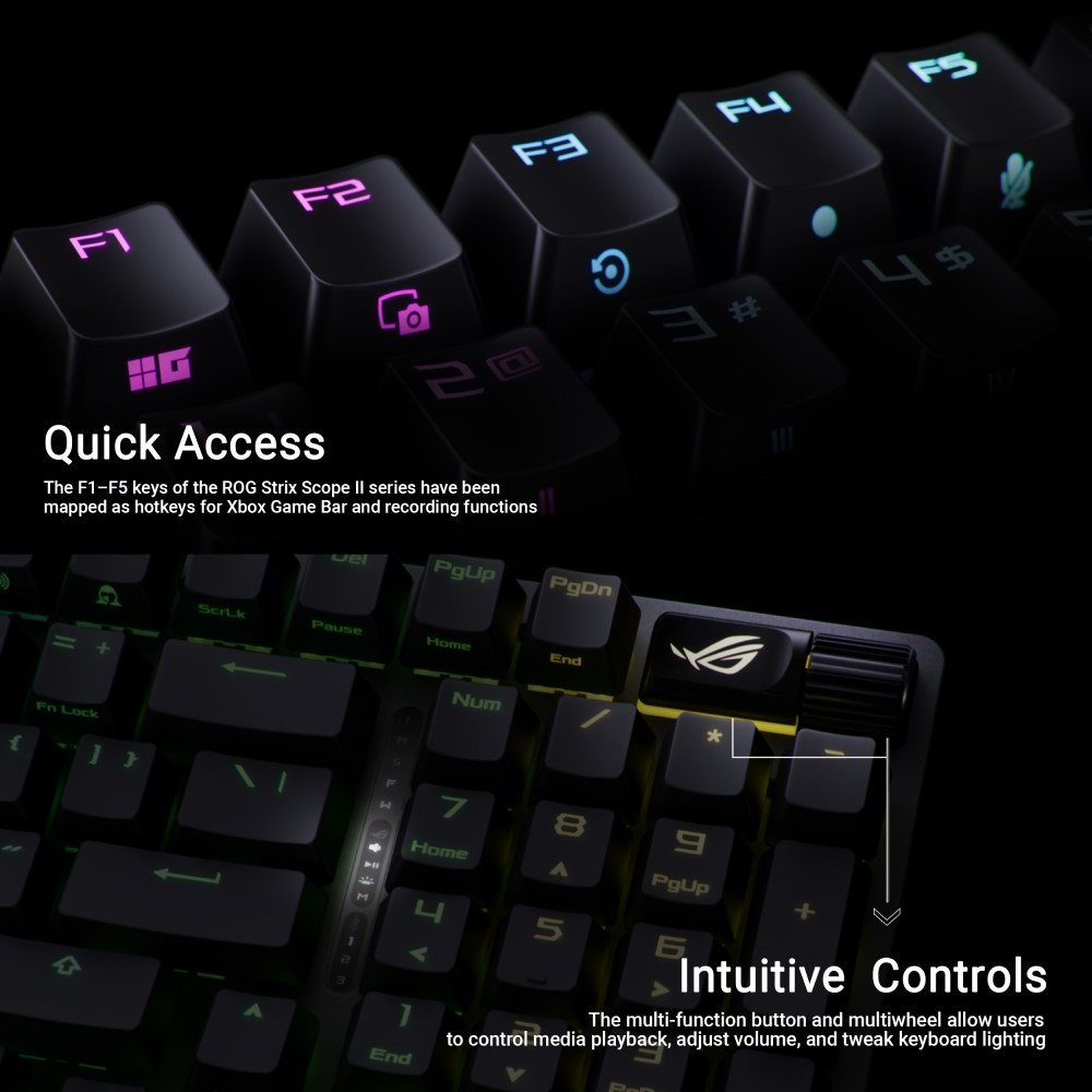 Bezdrôtová herná klávesnica ROG Strix Scope II 96 s pripojením v troch režimoch, klávesové skratky pre streamovanie, multifunkčné ovládacie prvky, mechanické spínače ROG NX s možnosťou výmeny za prevádzky, stabilizátory klávesnice ROG, krytky kláves PBT doubleshot a silikonová tlmená pena, tri uhly sklonu a opierka zápästia