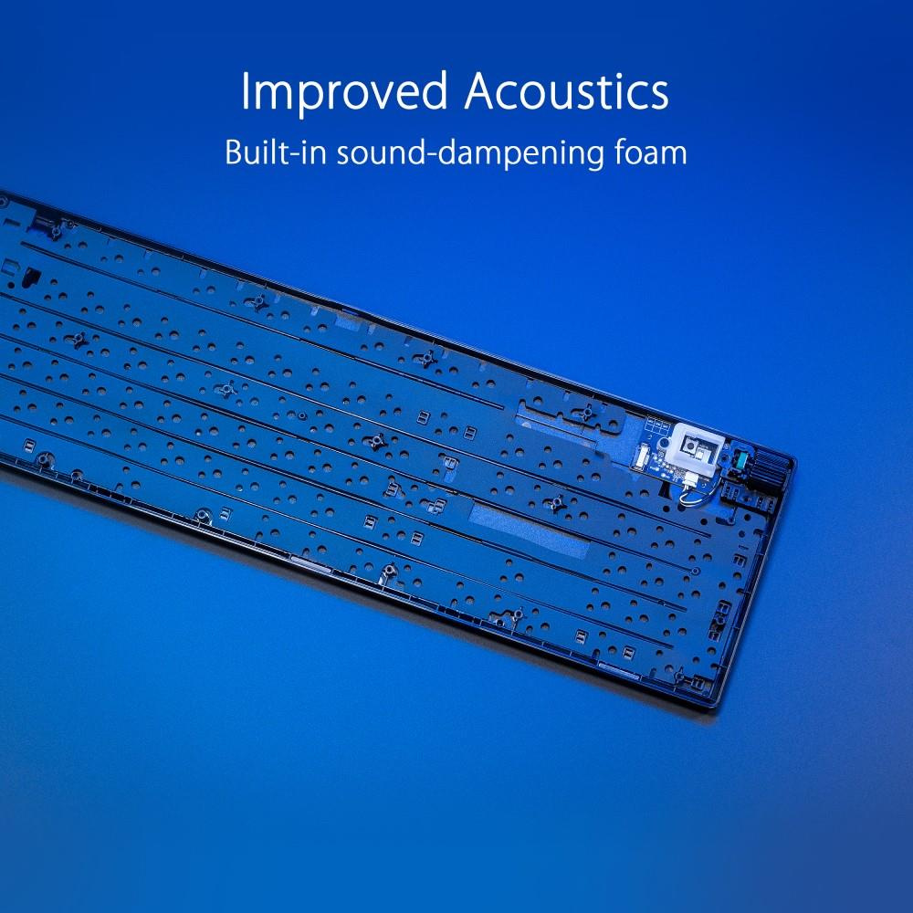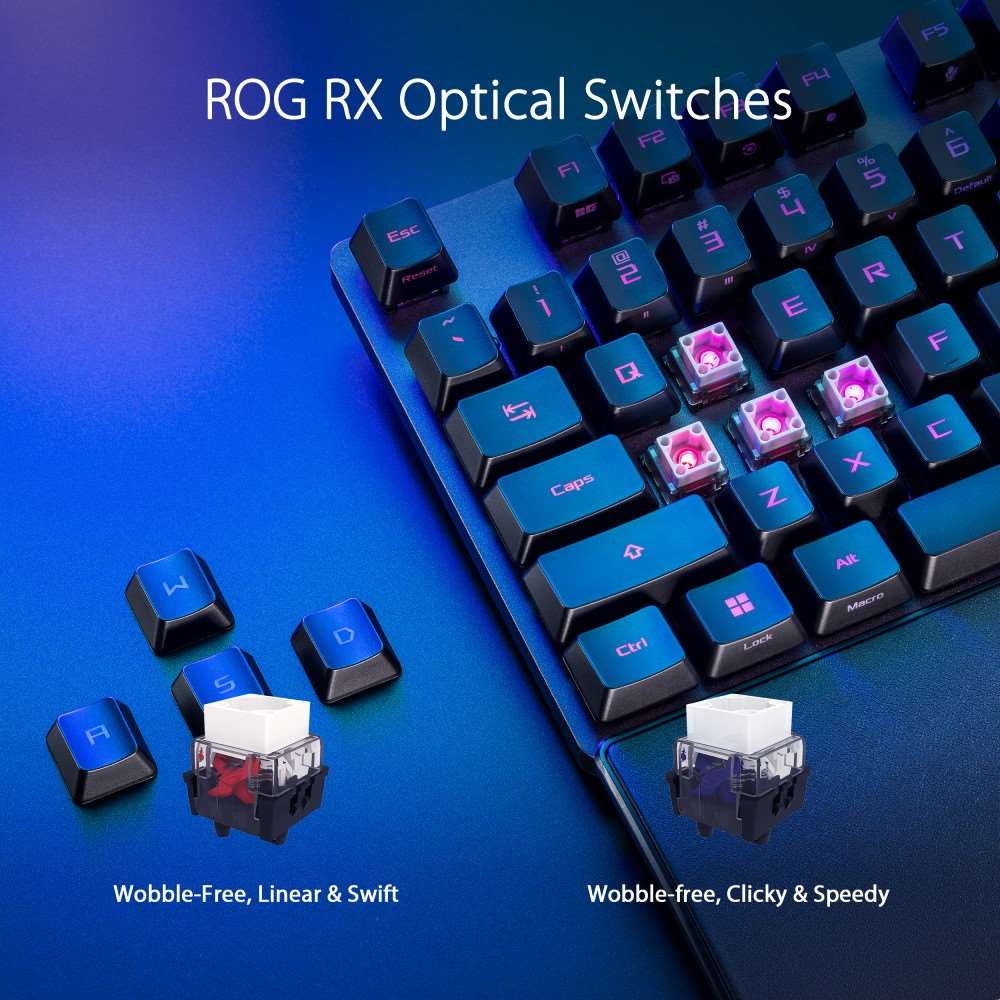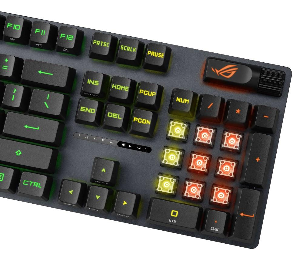 - PBT / ABS klávesy s UV vrstvou: Odolné klávesy ROG PBT doubleshot alebo klávesy ABS s UV vrstvou ponúkajú prvotriedny pocit a odolnosť voči lesku