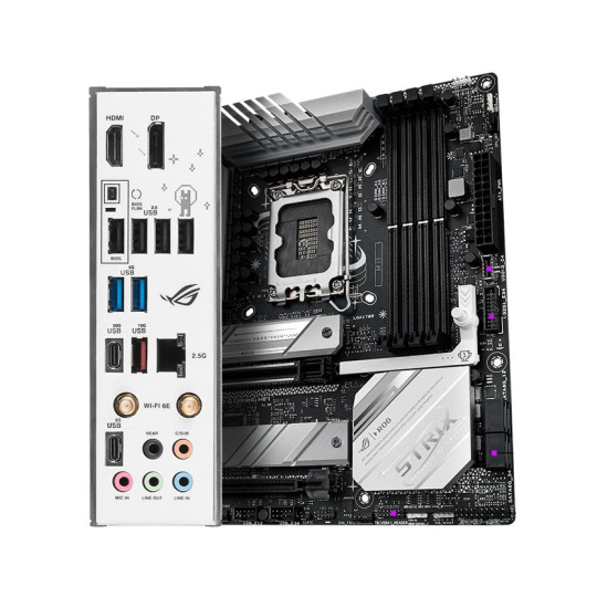 Midsize overperformer: the ROG Strix B760-G Gaming Wi-Fi is a monochrome powerhouse, ready to propel your next mATX rig. It bears the same high-bandwidth connectivity as its trusty counterpart, but diverges with lightning-fast DDR5 memory and buffed power stages to complement high-speed Intel 14th Gen processors. White and silver accents pair perfectly with the ASUS AP201, and retro insignias give it a dash of classic Strix style.