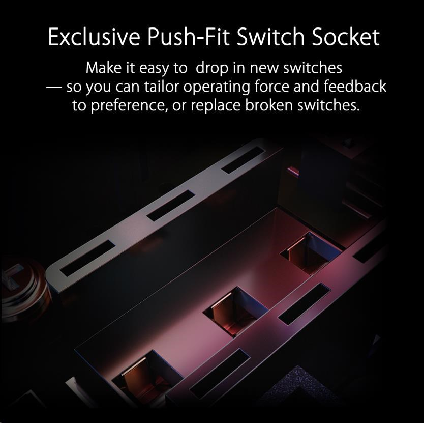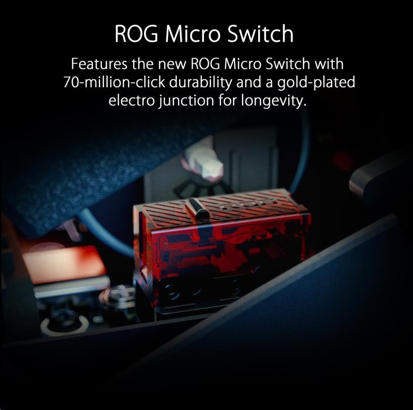 - ROG Micro Switch - ROG Micro Switch je vybavený pozláteným elektrospojom a životnosťou 70 miliónov kliknutí, čo zvyšuje odolnosť a predlžuje životnosť myši. Prísne výrobné štandardy ROG zaručujú, že každé tlačidlo myši si zachováva odchýlku sily v rozmedzí +/- 5 gramov pre konzistentný pocit z kliknutia.
