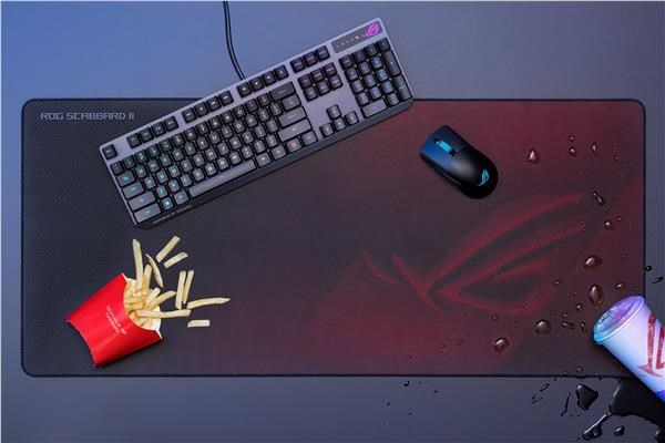 Predĺžená herná podložka pod myš ROG Scabbard II s ochrannou nano vrstvou pre povrch odpudzujúci vodu, olej a prach, s plochými šitými okrajmi proti šmuhám a protišmykovou gumovou základňou