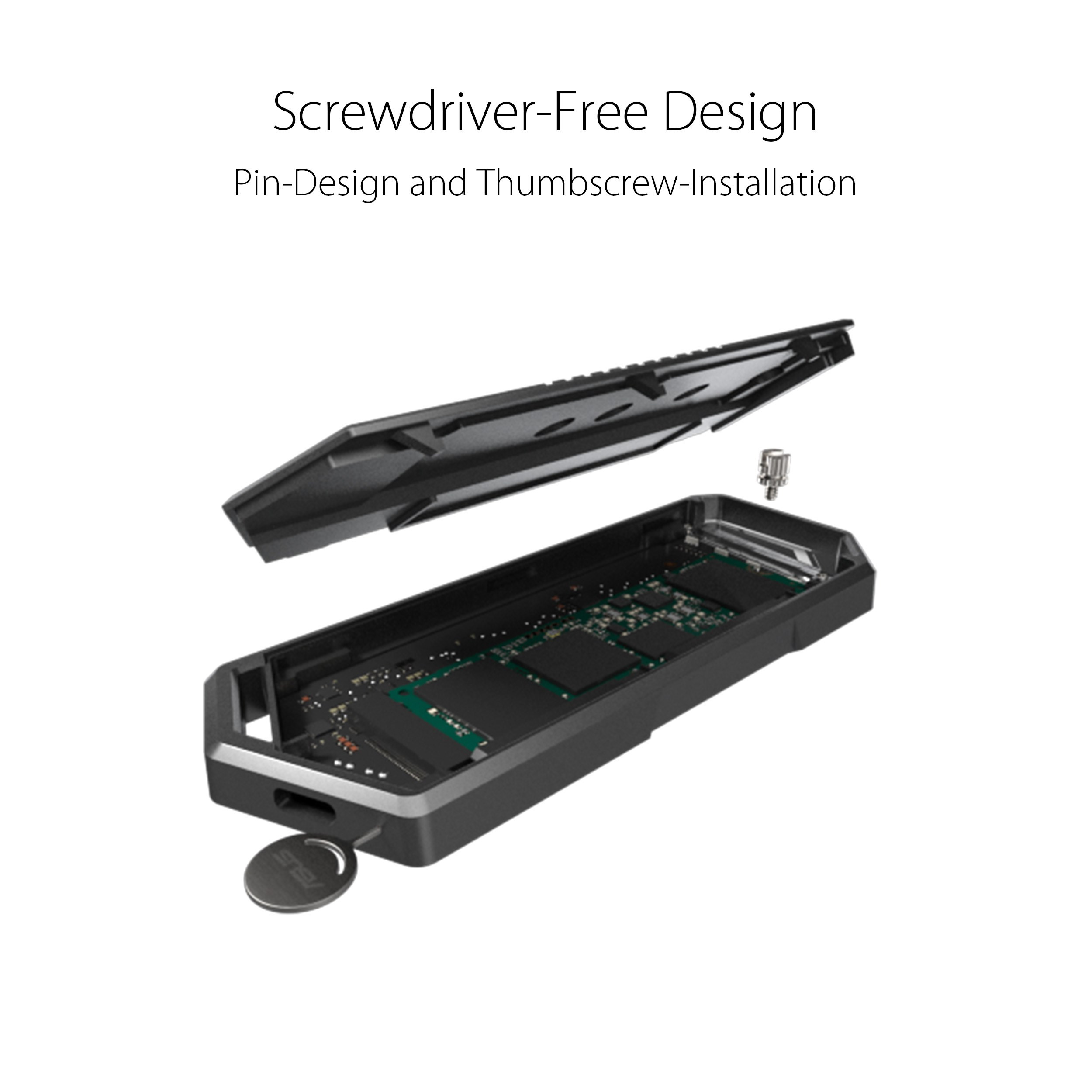 Box na externé disky M.2 NVMe SSD ROG Strix Arion - USB 3.2 GEN2 Type-C (10 Gb/s), dva káble USB-C do USB-C a USB-A, inštalácia bez použitia skrutkovača, obsahuje chladovacie podložky, vhodný pre PCIe 2280/2260/2242/2230 M key/B+M Key