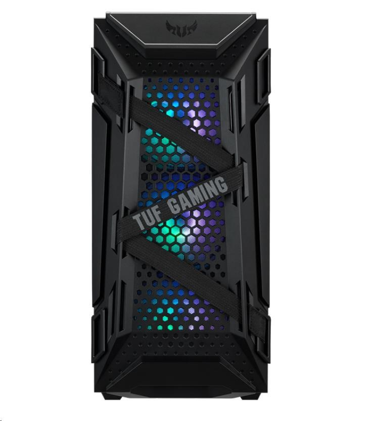 Kompaktná skrinka ASUS TUF Gaming GT301 ATX typu mid-tower s bočným panelom z tvrdeného skla, predným panelom voštinového typu, 120 mm ventilátorom AURA Addressable RGB, závesom na slúchadlá a 360 mm radiátorom.