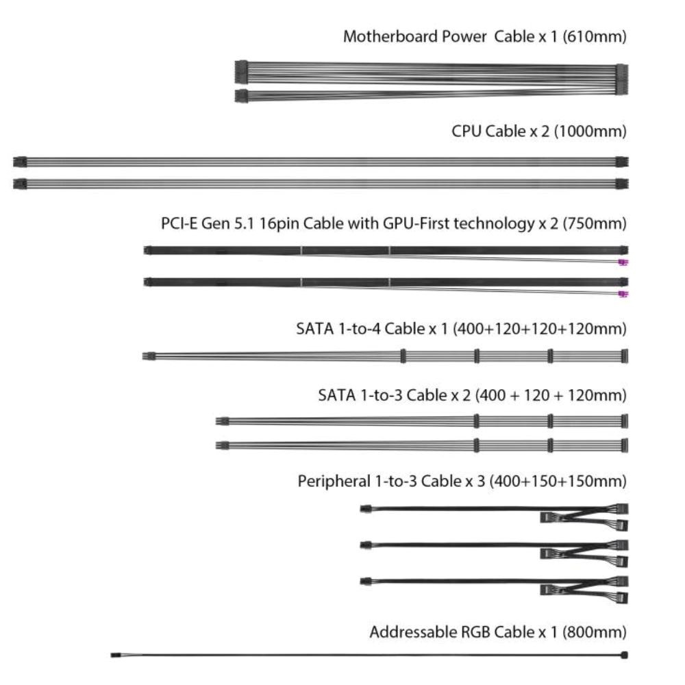 Formát zdroja:ATX; Konektory:8pin CPU 1x, 8pin CPU 2x, PCIe 6-pin, PCIe 8-pin, PCIe 16-pin Gen5, SATA 15-pin, Molex; Konektory pre základnú dosku:ATX 20-pin, ATX 24-pin, EPS 8-pin; Vlastnosti zdroja:Modulárna kabeláž.... viac