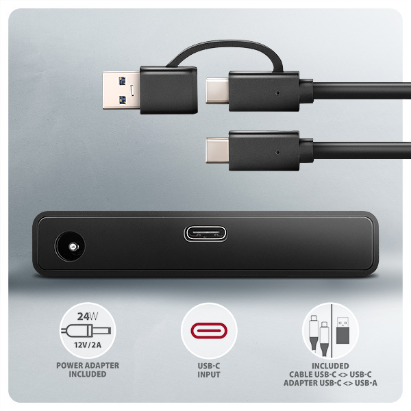 V balení nájdete 60 cm USB-C <-> USB-C kábel s pevne pripojeným USB-C na > USB-A adaptérom. Toto riešenie zvyšuje univerzálnosť adaptéra, ktorý môžete pripojiť k akémukoľvek USB portu na vašom počítači, či už k obojstrannému USB-C konektoru alebo k tradičnému USB-A konektoru. Súčasťou balenia je aj napájací adaptér 12V/2A (24W) pre napájanie 3,5" pevných diskov. Adaptér s 2,5" SSD/HDD je možné napájať cez USB zbernicu, čím sa eliminuje potreba manipulácie s napájaním.