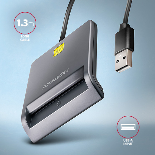 Kompaktná stolná čítačka Smart card / ID card AXAGON CRE-SM3T FlatReader s USB 2.0 rozhraním. Je vhodná najmä ako čítačka občianskych preukazov na použitie s počítačmi, ktoré disponujú USB vstupom. Najrozšírenejší USB-A konektor zaistí pripojenie k novému, tak aj staršiemu počítaču.