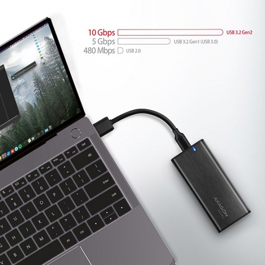 - Podporuje prenosové rýchlosti 10 000 / 5 000 / 480 Mbit/s (SuperSpeed+ / SuperSpeed / HighSpeed).